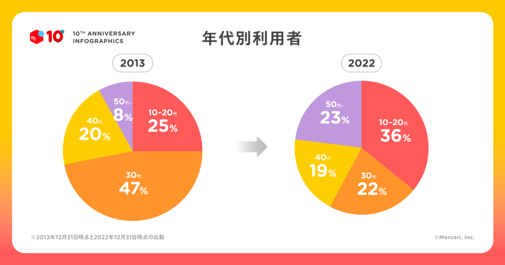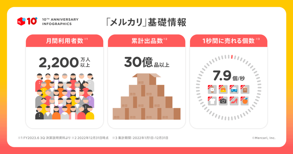 参考出典(画像含):mercari株式会社メルカリ, プレスリリース,フリマアプリ「メルカリ」、サービス開始10周年記念インフォグラフィックス公開,https://about.mercari.com/press/news/articles/20230630_infographics/,2016.0125